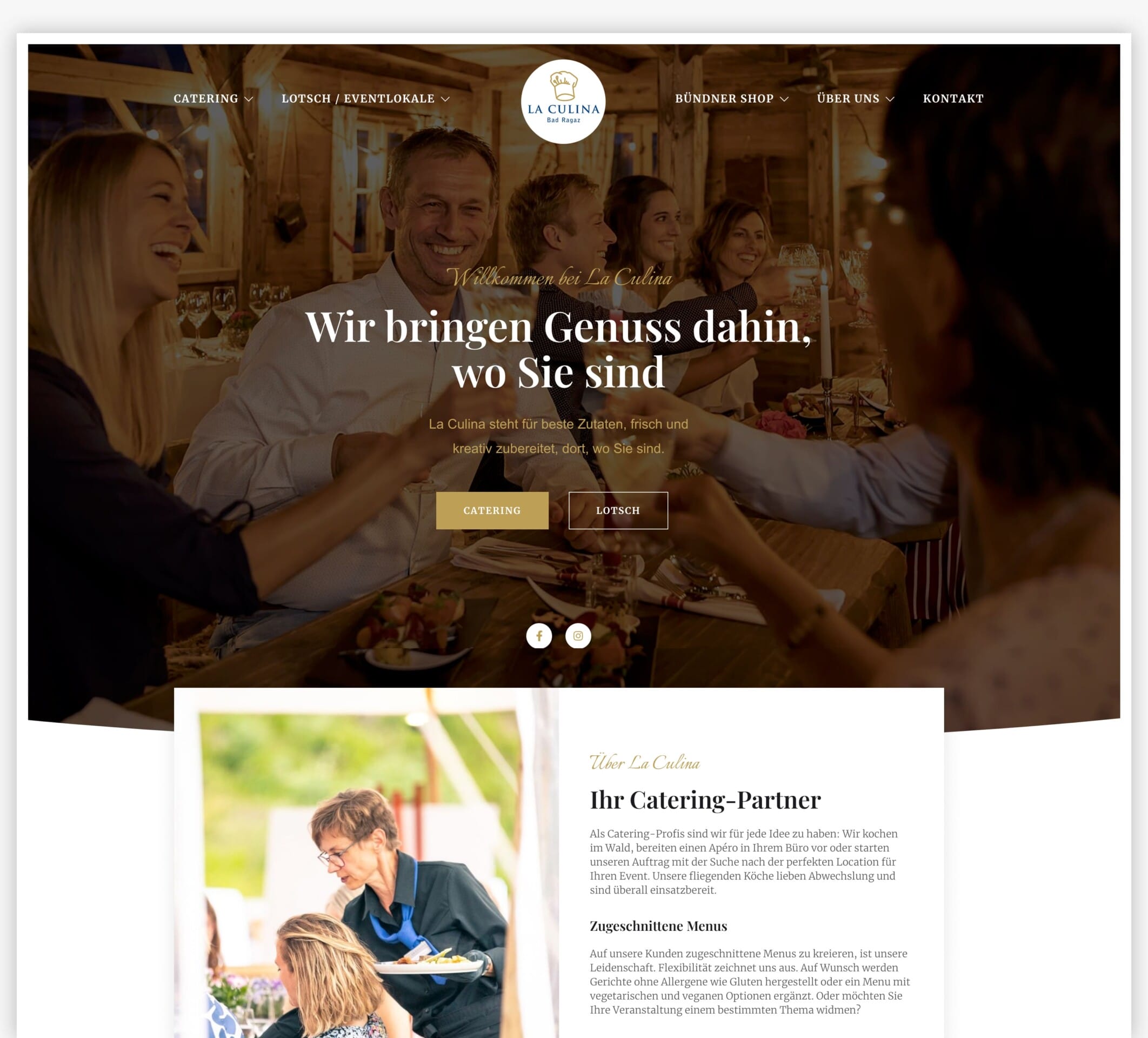 Gegenüber der vorherigen, alten Seite kommt das Angebot von La Culina schmackhaft daher. Wir platzierten das professionelle Bildmaterial auf den Landingpages und setzen eine Anfrageschiene auf.